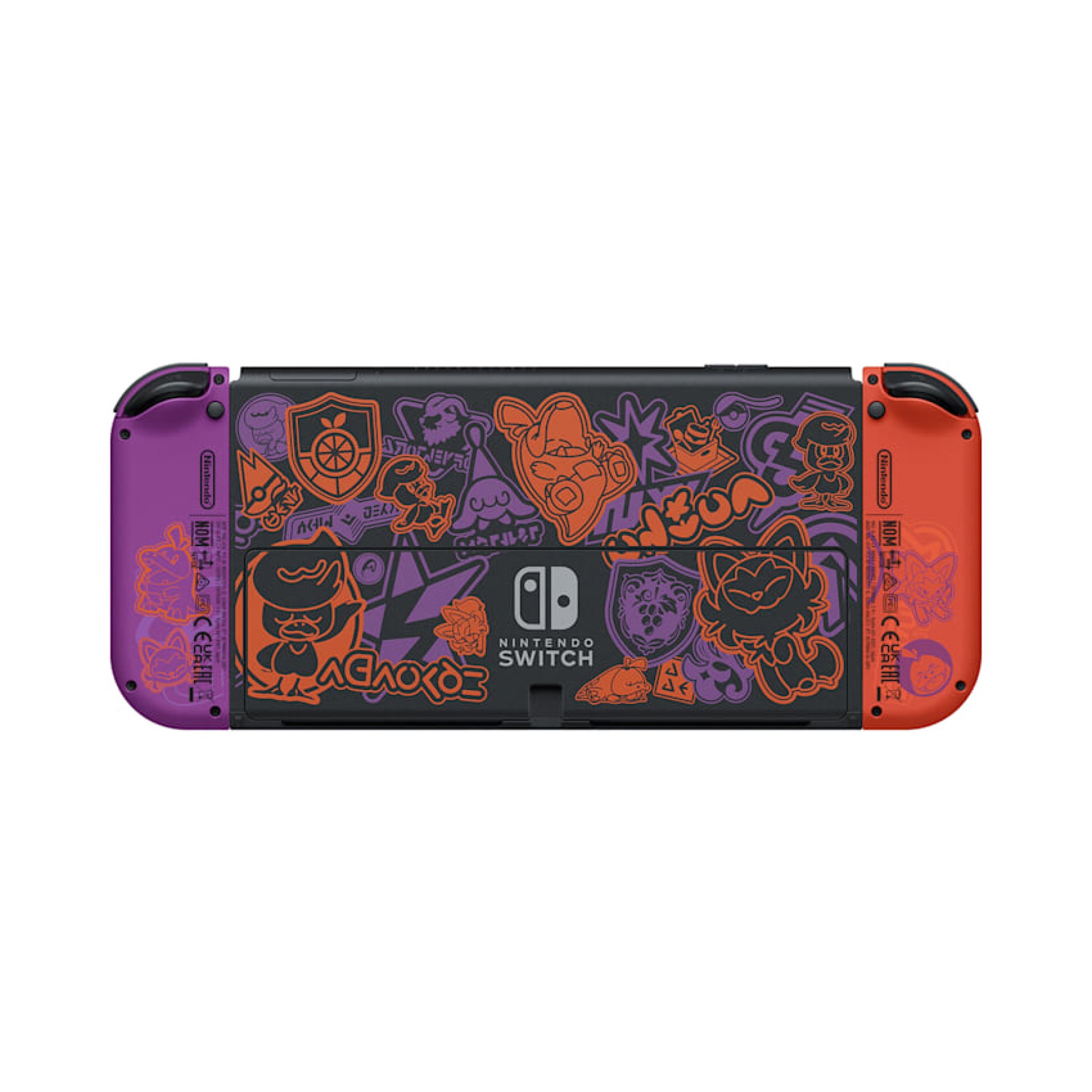 Cặp tay cầm Joy-Con trong bộ sản phẩm này mang hai tông màu chủ đạo đại diện cho hai học viện trong game: màu cam của học viện Naranja và màu tím của học viện Uva. Mặt trước của mỗi Joy-Con đều được in biểu tượng của các học viện tương ứng, trong khi mặt sau lại được trang trí bằng các hình vẽ Pokémon theo phong cách Graffiti đồng bộ với thân máy.